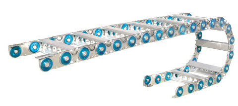 TL45 鋼鋁拖鏈的主體是由鏈板(優質鋼板鍍鉻)支撐板(擠拉鋁合金)軸銷(合金鋼)等部件組成,使電纜或橡膠管與拖鏈之間不產生相對運動,不產生扭曲變形,鏈板經鍍鉻處理外形效果新穎,結構合理,靈巧強度高,鋼性好不變形,安裝方便,使用可靠,易拆裝,尤其是本產品采用了高強度耐磨材料,合金銅為軸銷,提高了產品的耐磨強度,彎曲更靈活,阻力更小,降低了噪音,從而可保證長時間使用不變形,不下垂。
